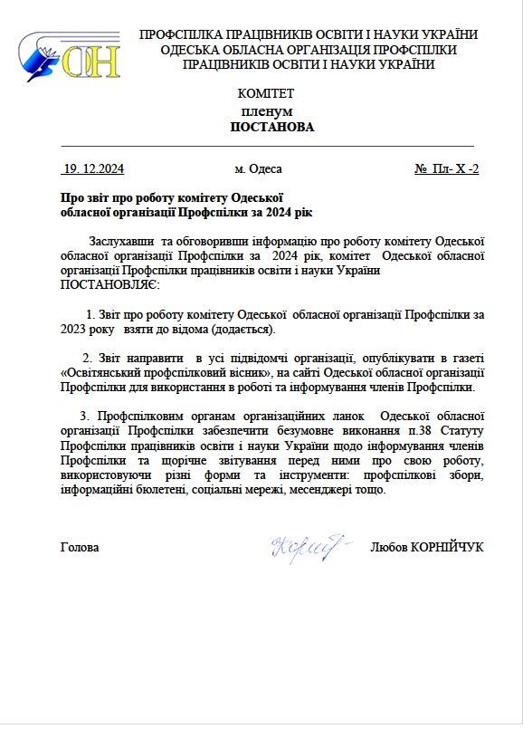ЗВІТ про роботу комітету Одеської обласної організації Профспілки працівників освіти і науки України за 2024 рік